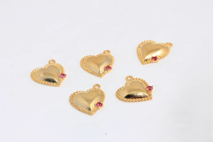 24K Gold Plated Pink Zircon Stone Heart Charm Heart Pendant. Dimensions: 15x17mm Price is per piece. 24K gold plated on brass. A Quality product resistant to rust and tarnishing. Do not contact with chemicals and perfumes for long-term use. Passed all tests does not contain harmful materials. Colors may vary depending on screen settings and ambient light.