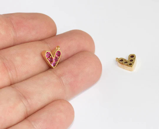 24K Gold Plated Pink Zircon Stone Shiny Heart Charms Heart Pendant. Dimensions: 10mm Price is per piece. 24K gold plated on brass. A Quality product does not rust or tarnish. Do not contact with chemicals and perfumes for long-term use. Passed all tests does not contain harmful materials. Colors may vary depending on screen settings and ambient light.