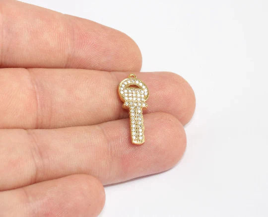 24K Gold Plated Purple Zircon Stone Shiny Key Charms Key Pendant. Dimensions: 10x25mm Price is per piece. 24K gold plated on brass. A Quality product resistant to rust and tarnishing. Do not contact with chemicals and perfumes for long-term use. Passed all tests does not contain harmful materials. Colors may vary depending on screen settings and ambient light.