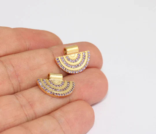 24K Gold Plated Purple Zircon Stone Shiny Semicircle Charms Semicircle Pendant. Dimensions: 13x18mm Price is per piece. 24K gold plated on brass. A Quality product resistant to rust and tarnishing. Do not contact with chemicals and perfumes for long-term use. Passed all tests does not contain harmful materials. Colors may vary depending on screen settings and ambient light.