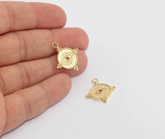 24 Carat Gold Plated Ruby Zircon Stone Eye Charms Eye Pendant. Dimensions: 20x23mm Price is per piece. 24 carat gold plated on brass. A Quality product does not rust or tarnish. Do not contact with chemicals and perfumes for long-term use. Passed all tests does not contain harmful materials. Colors may vary depending on screen settings and ambient light.