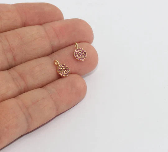 24 Carat Gold Plated Ruby Zircon Stone Shiny Round Charms Round Pendant. Dimensions: 7x10mm Price is per piece. 24 carat gold plated on brass. A Quality product does not rust or tarnish. Do not contact with chemicals and perfumes for long-term use. Passed all tests does not contain harmful materials. Colors may vary depending on screen settings and ambient light.