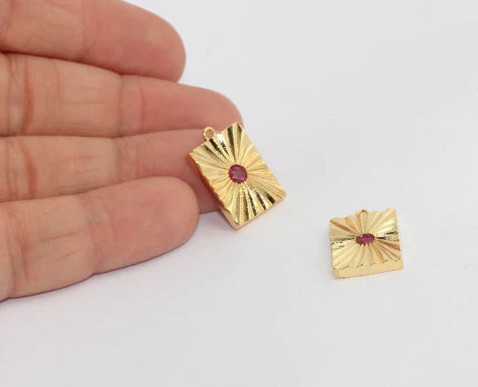 24 Carat Gold Plated Ruby Zircon Stone Shiny Square Charms Square Pendant. Dimensions: 13x20mm Price is per piece. 24 carat gold plated on brass. A Quality product resistant to rust and tarnishing. Do not contact with chemicals and perfumes for long-term use. Passed all tests does not contain harmful materials. Colors may vary depending on screen settings and ambient light.