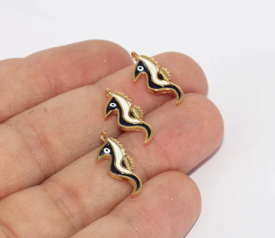 Shiny Gold Plated Sea Horse Pendant Black and White Enameled Dangling Bracelet Bangle Pendant Dimensions: 8x19mm Price is per piece. 24 carat gold plated on brass. A quality product resistant to rust and tarnishing. Do not contact with chemicals and perfumes for long-term use. It has passed all tests and does not contain harmful materials. Colors may vary depending on screen settings and ambient light.