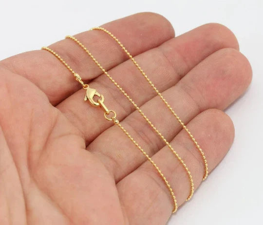 24K Gold Plated Shiny, 1mm Thin Ball Ready Chain. Dimensions: 43cm, - Price per piece. 24K gold plated on brass. A Quality product, resistant to rust and tarnishing. Do not contact with chemicals and perfumes for long-term use. Passed all tests, does not contain harmful materials. Colors may vary depending on screen settings and ambient light.