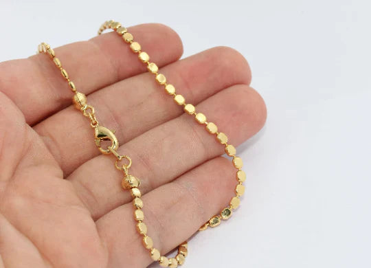 24K Gold Plated Shine 44cm, k Mini Oval Crush Ready Chain. Dimensions: 2.5mm - Price per piece. 24K gold plated on brass. A Quality product, does not rust or tarnish. Do not contact with chemicals and perfumes for long-term use. Passed all tests, does not contain harmful materials. Colors may vary depending on screen settings and ambient light.