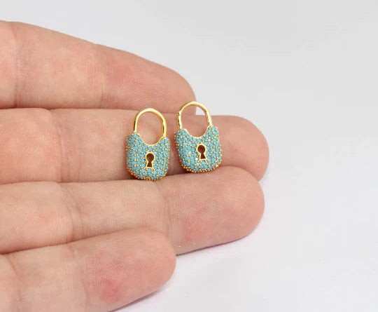 24 Carat Gold Plated Turquoise Zircon Stone Matte Lock Charms Lock Pendant. Dimensions: 11x17mm Price is per piece. 24 carat gold plated on brass. A Quality product resistant to rust and tarnishing. Do not contact with chemicals and perfumes for long-term use. Passed all tests does not contain harmful materials. Colors may vary depending on screen settings and ambient light.