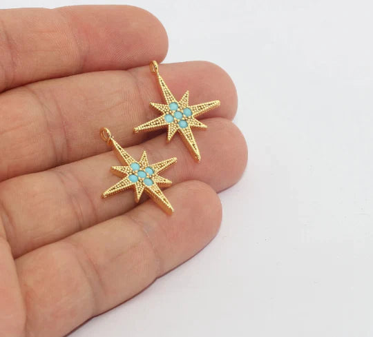 24K Gold Plated Turquoise Zircon Stone Shiny North Star Charms North Star Pendant. Dimensions: 24x28mm Price is per piece. 24K gold plated on brass. A Quality product resistant to rust and tarnishing. Do not contact with chemicals and perfumes for long-term use. Passed all tests does not contain harmful materials. Colors may vary depending on screen settings and ambient light.