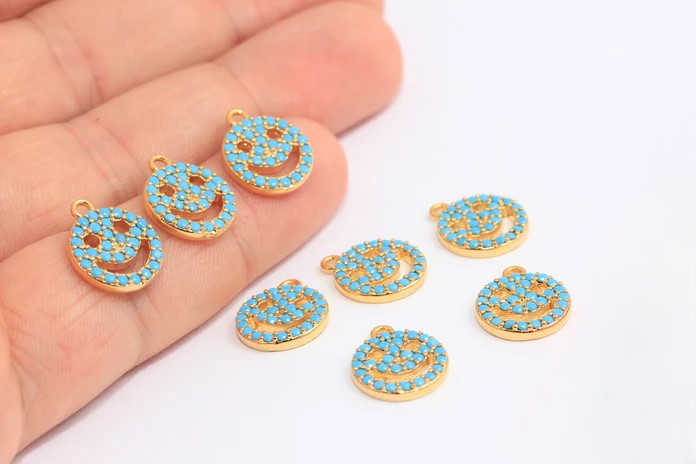 24K Gold Plated Turquoise Zircon Stone Shiny Smiling Face Charms Smiling Face Pendant. Dimensions: 12x14mm Price is per piece. 24K gold plated on brass. A Quality product resistant to rust and tarnishing. Do not contact with chemicals and perfumes for long-term use. Passed all tests does not contain harmful materials. Colors may vary depending on screen settings and ambient light.