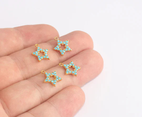 24 Carat Gold Plated Turquoise Zircon Stone Star Charms Star Pendant. Dimensions: 11x12mm Price is per piece. 24 carat gold plated on brass. A Quality product does not rust or tarnish. Do not contact with chemicals and perfumes for long-term use. Passed all tests does not contain harmful materials. Colors may vary depending on screen settings and ambient light.