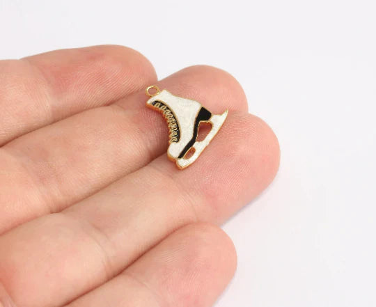24 Carat Gold Plated White and Black Enameled Ice Skate Pendant Skate Charm. Dimensions: 18mm Price is per piece. 24 carat gold plated on brass. A Quality product resistant to rust and tarnishing. Do not contact with chemicals and perfumes for long-term use. Passed all tests does not contain harmful materials. Colors may vary depending on screen settings and ambient light.