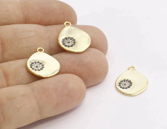 24K Gold Plated White Blue Zircon Stone Evil Eye Round Charms Evil Eye Round Pendant. Dimensions: 14x18mm Price is per piece. 24K gold plated on brass. A Quality product does not rust or tarnish. Do not contact with chemicals and perfumes for long-term use. Passed all tests does not contain harmful materials. Colors may vary depending on screen settings and ambient light.