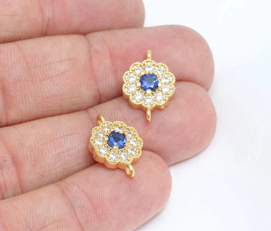 24K Gold Plated White Blue Zircon Stone Shiny Flower Charm Flower Pendant. Dimensions: 11x17mm Price is per piece. 24K gold plated on brass. A Quality product resistant to rust and tarnishing. Do not contact with chemicals and perfumes for long-term use. Passed all tests does not contain harmful materials. Colors may vary depending on screen settings and ambient light.