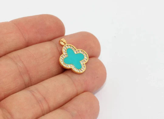 24K Gold Plated White Blue Zircon Stone Shiny Flower Charms Flower Pendant. Dimensions: 17x21mm Price is per piece. 24K gold plated on brass. A Quality product resistant to rust and tarnishing. Do not contact with chemicals and perfumes for long-term use. Passed all tests does not contain harmful materials. Colors may vary depending on screen settings and ambient light.