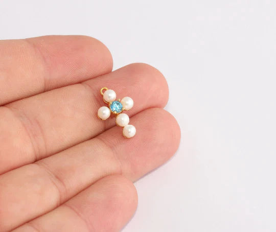 24K Gold Plated White Blue Zircon Stone Shiny Pearl Cross Charms Pearl Cross Pendant. Dimensions: 12x18mm Price is per piece. 24K gold plated on brass. A Quality product resistant to rust and tarnishing. Do not contact with chemicals and perfumes for long-term use. Passed all tests does not contain harmful materials. Colors may vary depending on screen settings and ambient light.
