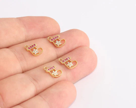 24K Gold Plated White Pink Zircon Stone Santa Claus Shoe Pendant Santa Claus Shoe Charms. Dimensions: 7x9mm Price is per piece. 24K gold plated on brass. A Quality product does not rust or tarnish. For long-term use do not contact with chemicals and perfumes. Passed all tests does not contain harmful materials. Colors may vary depending on screen settings and ambient light.