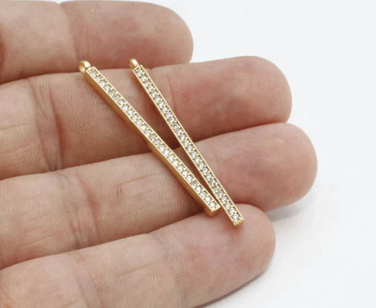 24K Gold Plated White Zircon Stone Shiny Rod Charms Rod Pendant. Dimensions: 2x43mm Price is per piece. 24K gold plated on brass. A Quality product resistant to rust and tarnishing. Do not contact with chemicals and perfumes for long-term use. Passed all tests does not contain harmful materials. Colors may vary depending on screen settings and ambient light.