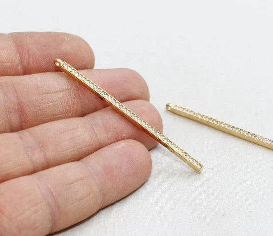 24K Gold Plated White Zircon Stone Shiny Rod Charms Rod Pendant. Dimensions: 2x58mm Price is per piece. 24K gold plated on brass. A Quality product resistant to rust and tarnishing. Do not contact with chemicals and perfumes for long-term use. Passed all tests does not contain harmful materials. Colors may vary depending on screen settings and ambient light.