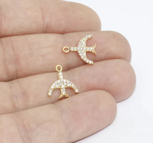 24 Carat Gold Plated White Zircon Stone Shiny Bird Charms Bird Pendant. Dimensions: 13mm Price is per piece. 24 carat gold plated on brass. A Quality product does not rust or tarnish. Do not contact with chemicals and perfumes for long-term use. Passed all tests does not contain harmful materials. Colors may vary depending on screen settings and ambient light.