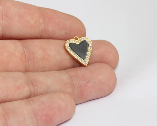 24K Gold Plated White Zircon Stone Shiny Black Heart Charms Heart Pendant. Dimensions: 15x18mm Price is per piece. 24K gold plated on brass. A Quality product resistant to rust and tarnishing. Do not contact with chemicals and perfumes for long-term use. Passed all tests does not contain harmful materials. Colors may vary depending on screen settings and ambient light.