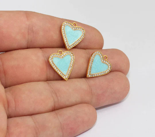 24K Gold Plated White Zircon Stone Shiny Blue Enameled Heart Charms Heart Pendant. Dimensions: 15x18mm Price is per piece. 24K gold plated on brass. A Quality product resistant to rust and tarnishing. Do not contact with chemicals and perfumes for long-term use. Passed all tests does not contain harmful materials. Colors may vary depending on screen settings and ambient light.