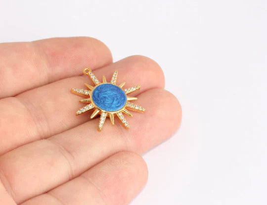 24K Gold Plated White Zircon Stone Bright Blue Enameled Stone Sun Charms Sun Pendant. Dimensions: 26x28mm Price is per piece. 24K gold plated on brass. A Quality product resistant to rust and tarnishing. Do not contact with chemicals and perfumes for long-term use. Passed all tests does not contain harmful materials. Colors may vary depending on screen settings and ambient light.