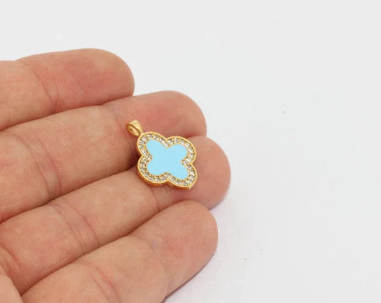 24K Gold Plated White Zircon Stone Shiny Blue Flower Charms Blue Flower Pendant. Dimensions: 17x21mm Price is per piece. 24K gold plated on brass. A Quality product resistant to rust and tarnishing. Do not contact with chemicals and perfumes for long-term use. Passed all tests does not contain harmful materials. Colors may vary depending on screen settings and ambient light.