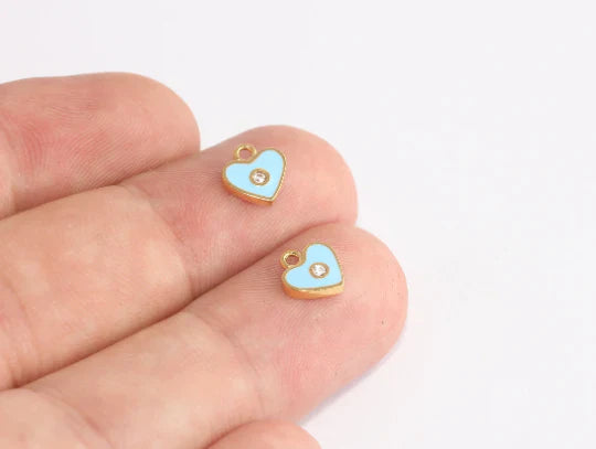 24K Gold Plated White Zircon Stone Blue Heart Charms Blue Heart Pendant. Dimensions: 8mm Price is per piece. 24K gold plated on brass. A Quality product does not rust or tarnish. Do not contact with chemicals and perfumes for long-term use. Passed all tests does not contain harmful materials. Colors may vary depending on screen settings and ambient light.