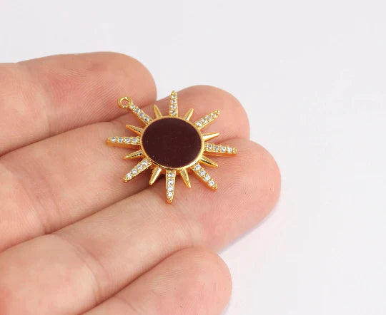 24K Gold Plated White Zircon Stone Shiny Brown Enameled Stone Sun Charms Sun Pendant. Dimensions: 26x28mm Price is per piece. 24K gold plated on brass. A Quality product resistant to rust and tarnishing. Do not contact with chemicals and perfumes for long-term use. Passed all tests does not contain harmful materials. Colors may vary depending on screen settings and ambient light.