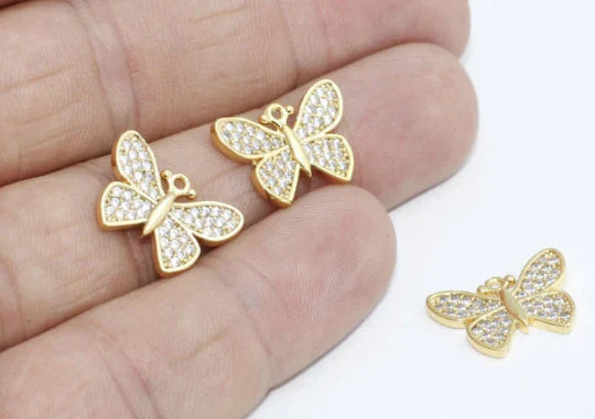24 Carat Gold Plated White Zircon Stone Shiny Butterfly Charms Butterfly Pendant. Dimensions: 12x17mm Price is per piece. 24 carat gold plated on brass. A Quality product does not rust or tarnish. Do not contact with chemicals and perfumes for long-term use. Passed all tests does not contain harmful materials. Colors may vary depending on screen settings and ambient light.