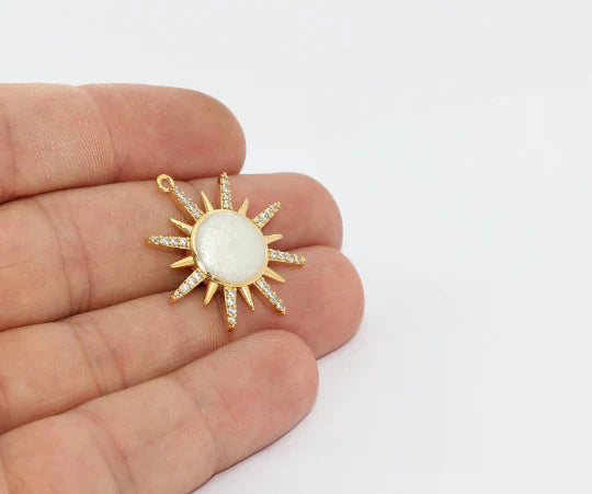 24K Gold Plated White Zircon Stone Shiny Cream Enamel Stone Sun Charms Sun Pendant. Dimensions: 26x28mm Price is per piece. 24K gold plated on brass. A Quality product resistant to rust and tarnishing. Do not contact with chemicals and perfumes for long-term use. Passed all tests does not contain harmful materials. Colors may vary depending on screen settings and ambient light.
