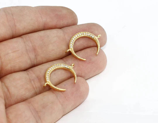 24 Carat Gold Plated White Zircon Stone Shiny Crescent Charms Crescent Pendant. Dimensions: 17x24mm Price is per piece. 24 carat gold plated on brass. A Quality product resistant to rust and tarnishing. Do not contact with chemicals and perfumes for long-term use. Passed all tests does not contain harmful materials. Colors may vary depending on screen settings and ambient light.