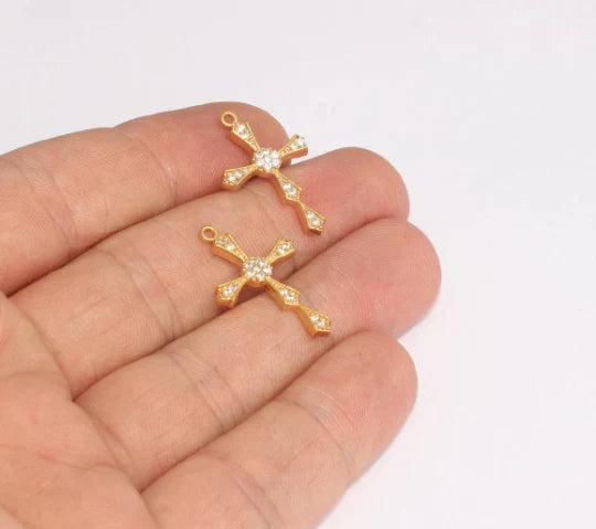 24K Gold Plated White Zircon Stone Shiny Cross Charms Cross Pendant. Dimensions: 16x25mm Price is per piece. 24K gold plated on brass. A Quality product resistant to rust and tarnishing. Do not contact with chemicals and perfumes for long-term use. Passed all tests does not contain harmful materials. Colors may vary depending on screen settings and ambient light.