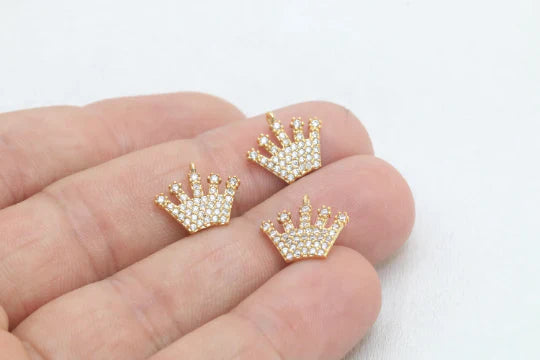 24K Gold Plated White Shiny Zircon Stone Crown Charms Crown Pendant. Dimensions: 12x13mm Price is per piece. 24K gold plated on brass. A Quality product does not rust or tarnish. Do not contact with chemicals and perfumes for long-term use. Passed all tests does not contain harmful materials. Colors may vary depending on screen settings and ambient light.