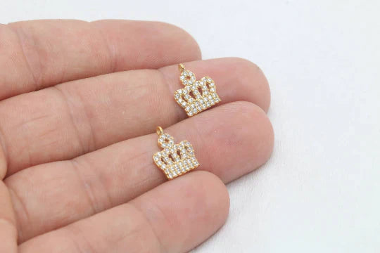 24 Carat Gold Plated White Zircon Stone Shiny Crown Charms Crown Pendant. Dimensions: 11x12mm Price is per piece. 24 carat gold plated on brass. A Quality product does not rust or tarnish. Do not contact with chemicals and perfumes for long-term use. Passed all tests does not contain harmful materials. Colors may vary depending on screen settings and ambient light.