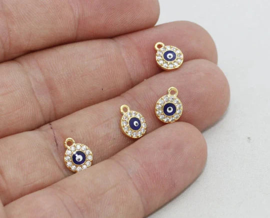 24K Gold Plated White Zircon Stone Shiny Evil Eye Charms Evil Eye Pendant. Dimensions: 7x9mm Price is per piece. 24K gold plated on brass. A Quality product does not rust or tarnish. Do not contact with chemicals and perfumes for long-term use. Passed all tests does not contain harmful materials. Colors may vary depending on screen settings and ambient light.