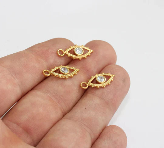 24 Carat Gold Plated White Zircon Stone Eye Charms Eye Pendant. Dimensions: 9x20mm Price is per piece. 24 carat gold plated on brass. A Quality product does not rust or tarnish. Do not contact with chemicals and perfumes for long-term use. Passed all tests does not contain harmful materials. Colors may vary depending on screen settings and ambient light.