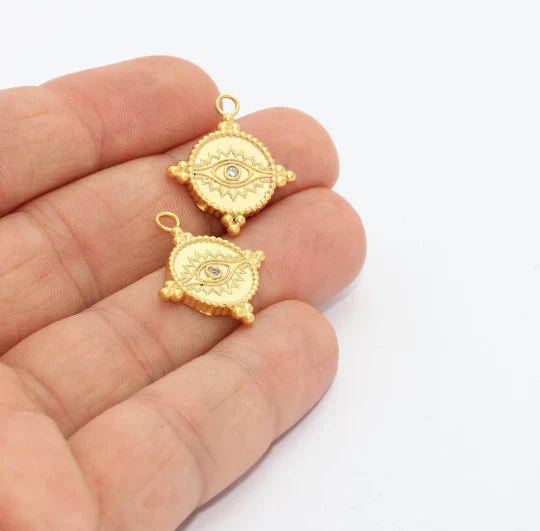 24K Gold Plated White Zircon Stone Matte Eye Charms Eye Pendant. Dimensions: 20x23mm Price is per piece. 24K gold plated on brass. A Quality product does not rust or tarnish. Do not contact with chemicals and perfumes for long-term use. Passed all tests does not contain harmful materials. Colors may vary depending on screen settings and ambient light.