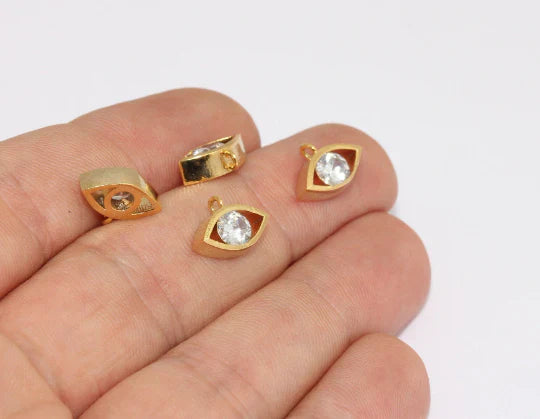 24 Carat Gold Plated White Zircon Stone Shiny Eye Charms Eye Pendant. Dimensions: 8x12mm Price is per piece. 24 carat gold plated on brass. A Quality product does not rust or tarnish. Do not contact with chemicals and perfumes for long-term use. Passed all tests does not contain harmful materials. Colors may vary depending on screen settings and ambient light.
