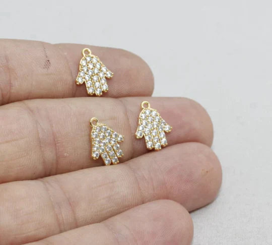 24K Gold Plated White Zircon Stone Shiny Fatima Hand Charms Fatima Hand Pendant. Dimensions: 10x13mm Price is per piece. 24K gold plated on brass. A Quality product does not rust or tarnish. Do not contact with chemicals and perfumes for long-term use. Passed all tests does not contain harmful materials. Colors may vary depending on screen settings and ambient light.