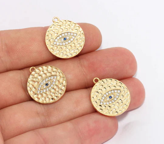 24K Gold Plated White Zircon Stone Tattoo Shiny Eye Medallion Charms Eye Medallion Pendant. Dimensions: 18x21mm Price is per piece. 24K gold plated on brass. A Quality product resistant to rust and tarnishing. Do not contact with chemicals and perfumes for long-term use. Passed all tests does not contain harmful materials. Colors may vary depending on screen settings and ambient light.