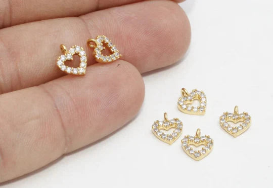 24 Carat Gold Plated White Zircon Stone Heart Charm Mini Heart Pendant. Dimensions: 8mm Price is per piece. 24 carat gold plated on brass. A Quality product does not rust or tarnish. Do not contact with chemicals and perfumes for long-term use. Passed all tests does not contain harmful materials. Colors may vary depending on screen settings and ambient light.