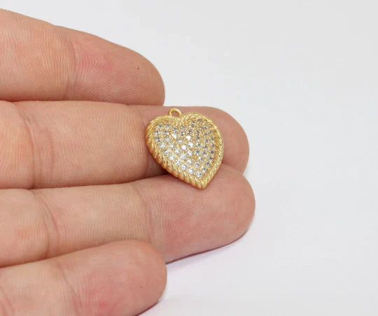24K Gold Plated White Zircon Stone Shiny Heart Charms Heart Pendant. Dimensions: 18x21mm Price is per piece. 24K gold plated on brass. A Quality product resistant to rust and tarnishing. Do not contact with chemicals and perfumes for long-term use. Passed all tests does not contain harmful materials. Colors may vary depending on screen settings and ambient light.