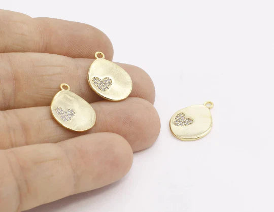 24K Gold Plated White Zircon Stone Shiny Heart Round Charms Heart Round Pendant. Dimensions: 15x20mm Price is per piece. 24K gold plated on brass. A Quality product does not rust or tarnish. Do not contact with chemicals and perfumes for long-term use. Passed all tests does not contain harmful materials. Colors may vary depending on screen settings and ambient light.