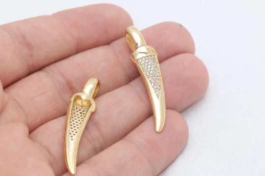 24K Gold Plated White Zircon Stone Shiny Ivory Charms Ivory Pendant. Dimensions: 10x41mm Price is per piece. 24K gold plated on brass. A Quality product resistant to rust and tarnishing. Do not contact with chemicals and perfumes for long-term use. Passed all tests does not contain harmful materials. Colors may vary depending on screen settings and ambient light.