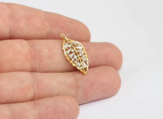 24K Gold Plated White Zircon Stone Shiny Leaf Charms Leaf Pendant. Dimensions: 13x27mm Price is per piece. 24K gold plated on brass. A Quality product resistant to rust and tarnishing. Do not contact with chemicals and perfumes for long-term use. Passed all tests does not contain harmful materials. Colors may vary depending on screen settings and ambient light.