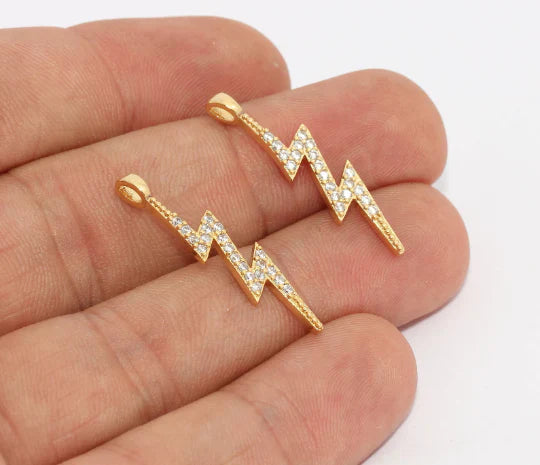 24K Gold Plated White Zircon Stone Shiny Lightning Charms Lightning Pendant. Dimensions: 6x25mm Price is per piece. 24K gold plated on brass. A Quality product resistant to rust and tarnishing. Do not contact with chemicals and perfumes for long-term use. Passed all tests does not contain harmful materials. Colors may vary depending on screen settings and ambient light.