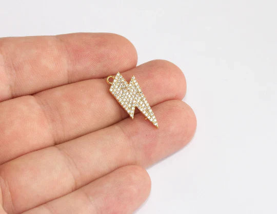 24K Gold Plated White Zircon Stone Shiny Lightning Charms Lightning Pendant. Dimensions: 10x25mm Price is per piece. 24K gold plated on brass. A Quality product resistant to rust and tarnishing. Do not contact with chemicals and perfumes for long-term use. Passed all tests does not contain harmful materials. Colors may vary depending on screen settings and ambient light.
