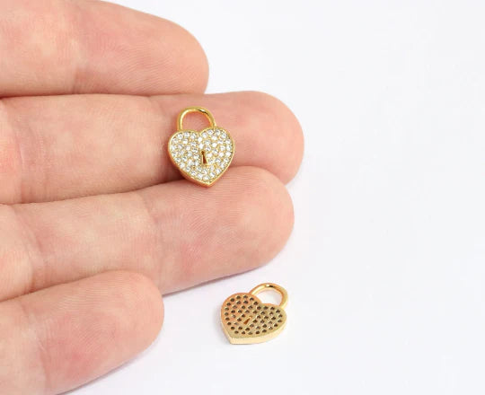 24K Gold Plated White Zircon Stone Shiny Lock Heart Charms Lock Heart Pendant. Dimensions: 12x16mm Price is per piece. 24K gold plated on brass. A Quality product does not rust or tarnish. Do not contact with chemicals and perfumes for long-term use. Passed all tests does not contain harmful materials. Colors may vary depending on screen settings and ambient light.