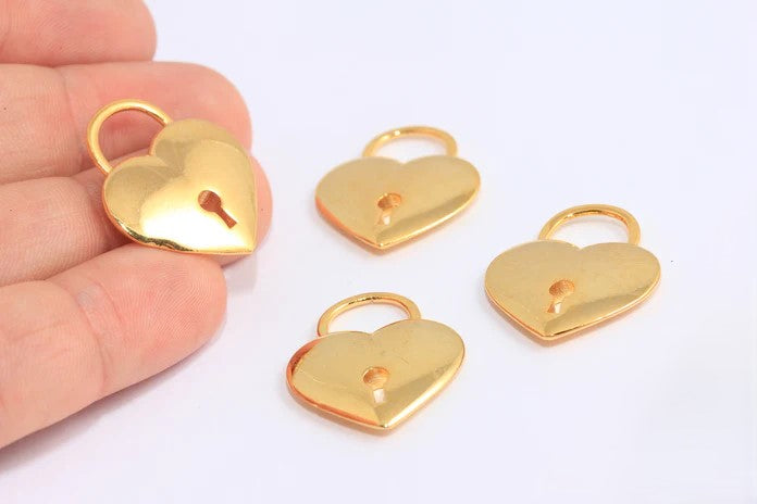 24K Gold Plated White Zircon Stone Shiny Locked Heart Charms Locked Heart Pendant. Dimensions: 23x27mm Price is per piece. 24K gold plated on brass. A Quality product resistant to rust and tarnishing. Do not contact with chemicals and perfumes for long-term use. Passed all tests does not contain harmful materials. Colors may vary depending on screen settings and ambient light.